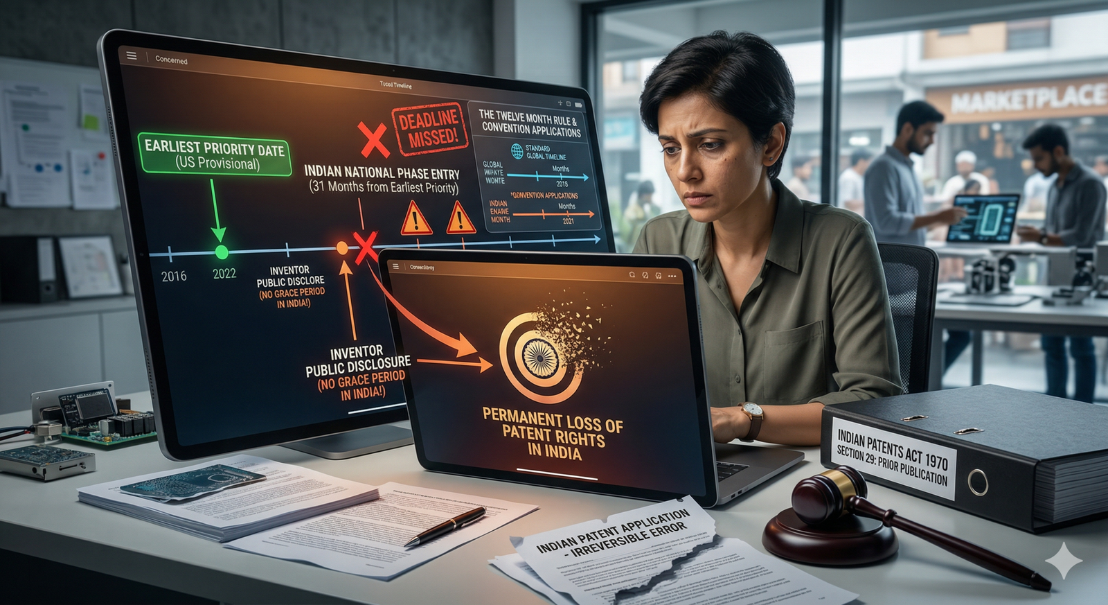Priority errors of a certain type leave an applicant with no patent right in India and no way to recover it. The technology enters the public domain. The competitor who was watching the space can use it freely. The startup that built the invention has no protection.